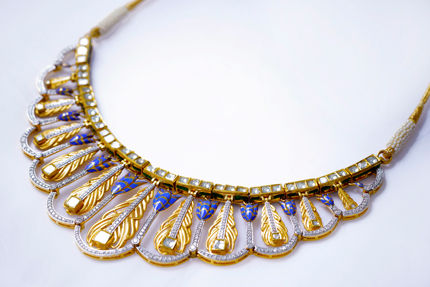 Krsna collection is an ideal combination of technology, unique art and tradition. The craft palette features the technique of painting enamel along with Champlevé enamel in its rich Indian avatar and partaj engraving along with glittering polki in 24K kundan setting. Each technology spectrum entails intricate painting, first designed on a tablet with a stylus, computer aided manufacturing, rapid proto typing, gold casting and modern diamond setting, executed by master craftsmen at Zoya.