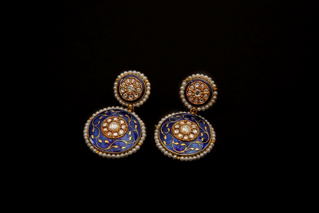 Designed and crafted with rose cut diamonds in the shape of fishes and blue colored meenakari depicting water in the pond is a definite show stealer. Unique by its color, the neckpiece wondrously hugs your neck in a comfortable setting.