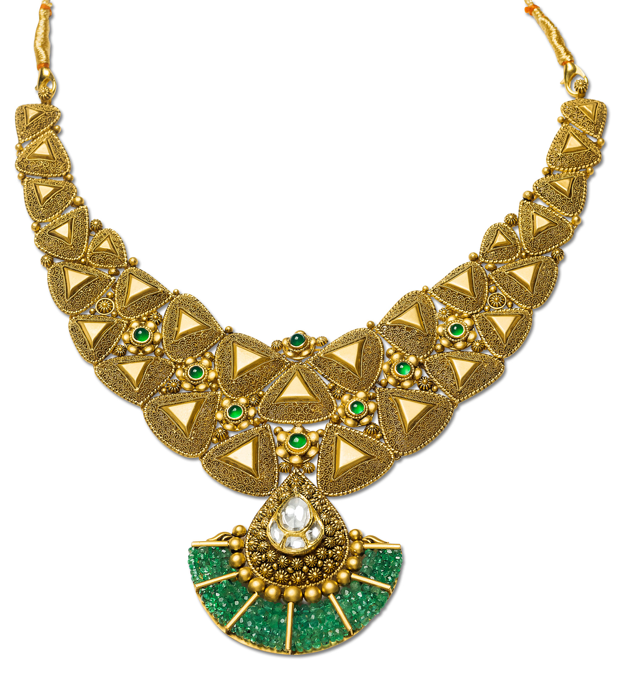 The other stunning Aztec shape inspired gold necklace is a true representation of the global Indian consumer. An amalgamation of traditional craftsmanship of beadwork with the raw geometric form has created this stunning neckwear. Infused with the color of the year turquoise, the necklace is aptly set with 94 grams of 22k gold this piece fits well into the lightweight category of price and dazzle.