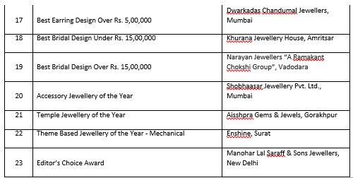 Prominent amongst the winners in Design categories were Paulomi Sanghavi who won awards in the Men’s Jewellery of the Year. Narayan Jewellers, A Ramakant Chokshi Group won the Best Bridal Design Over Rs. 15,00,000. Theme Based Jewellery of the Year – Mechanical won by Enshine, Best Necklace Design Over Rs. 10,00,000 won by PN Gadgil Jewellers & Ghanasingh Be True. Accessory Jewellery of the year Won by Shobha Asar Jewellery. Other winners included, Jewel Saga, Dwarkadas Chandumal Jewellers, Raniwala Jewellers, Emerald Jewel Industry, Gold Artism, NEETTI, Anand Shah Jewels and many more. Detailed list is at the bottom of the release.