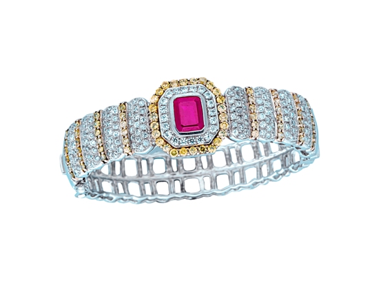 The bracelets combine a stunning array of luminous colors, contemporary designs and fiery diamonds tailored to individualistic specifications. Every piece is an original design using eclectic mix of diamonds, sapphires, emeralds and rubies. These signature creations are tribute to the queen of gems whose allure the wearer may treasure of generations.