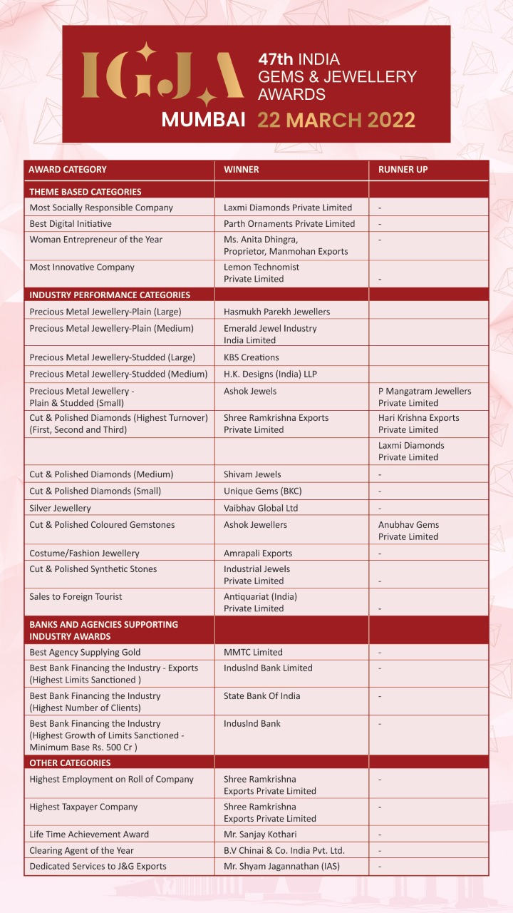 The 47th India Gem and Jewellery Awards (IGJA) 2022, powered by GIA, being presented for the financial year 2019-20, took off on a high note at Taj Lands End, Mumbai, on Tuesday, March 22.