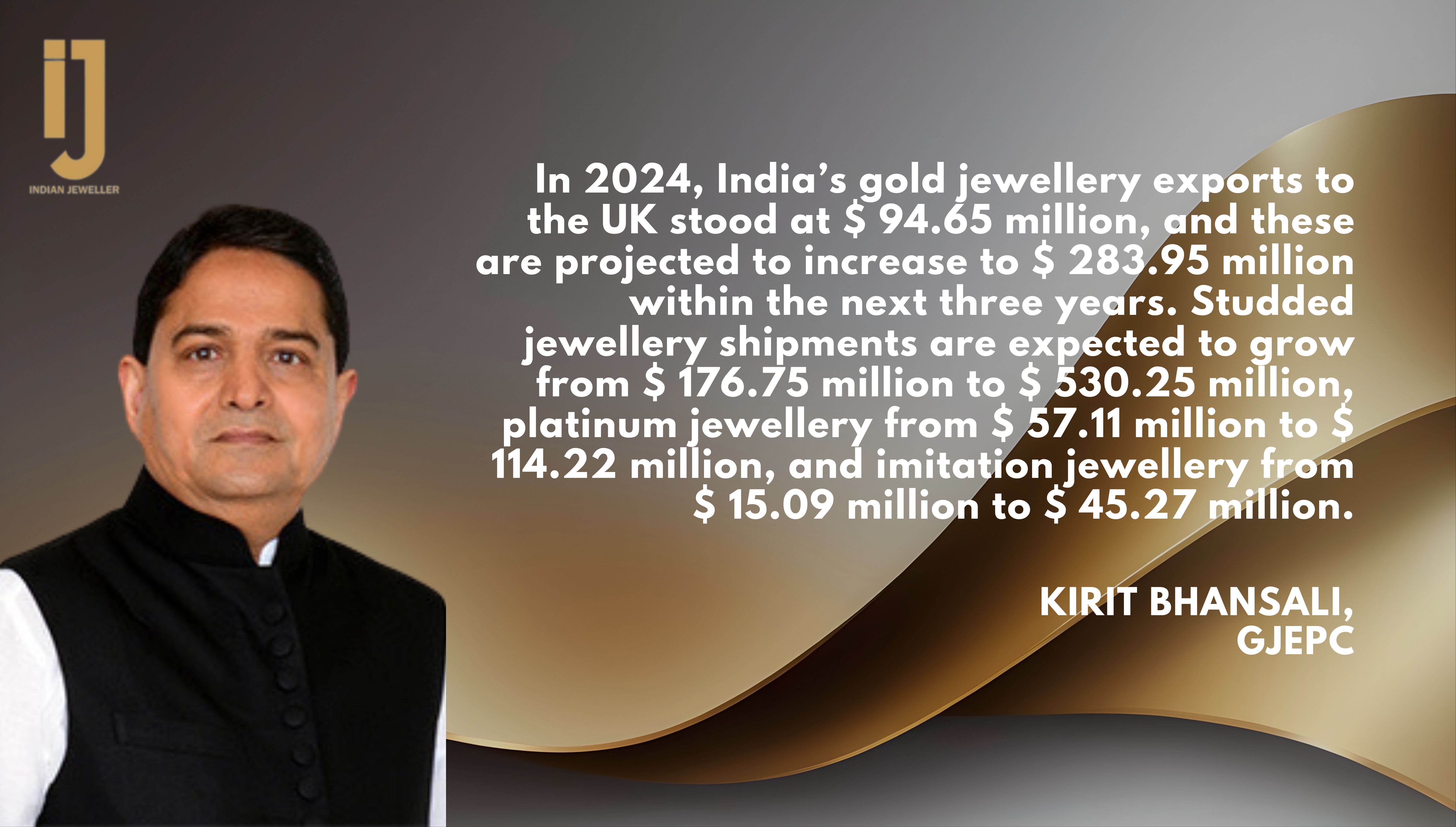 In 2024, India’s gold jewellery exports to the UK stood at $ 94.65 million, and these are projected to increase to $ 283.95 million within the next three years. Studded jewellery shipments are expected to grow from $ 176.75 million to $ 530.25 million, platinum jewellery from $ 57.11 million to $ 114.22 million, and imitation jewellery from $ 15.09 million to $ 45.27 million.