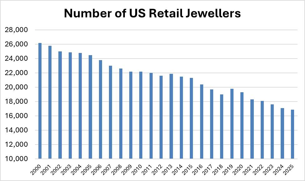 Industry consolidation continues as store counts shrink. Only 16,873 jewellery retail businesses were active in the US in Q2 2025, a decline of 13% since 2020, according to the Jewellers Board of Trade (JBT). While the base of operators is narrowing, analysts note that the remaining retailers are stronger, better capitalised and more prepared to navigate structural challenges.