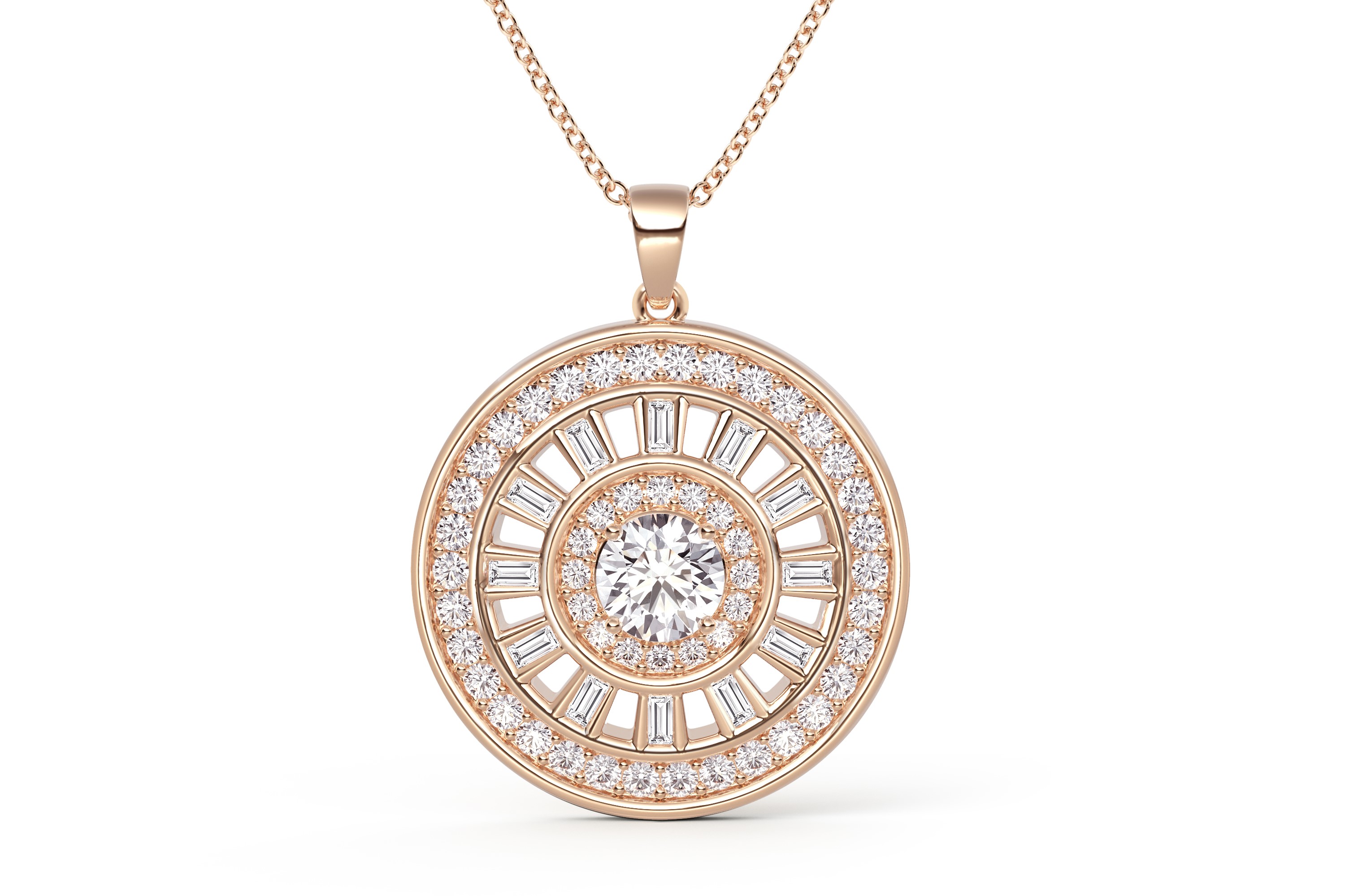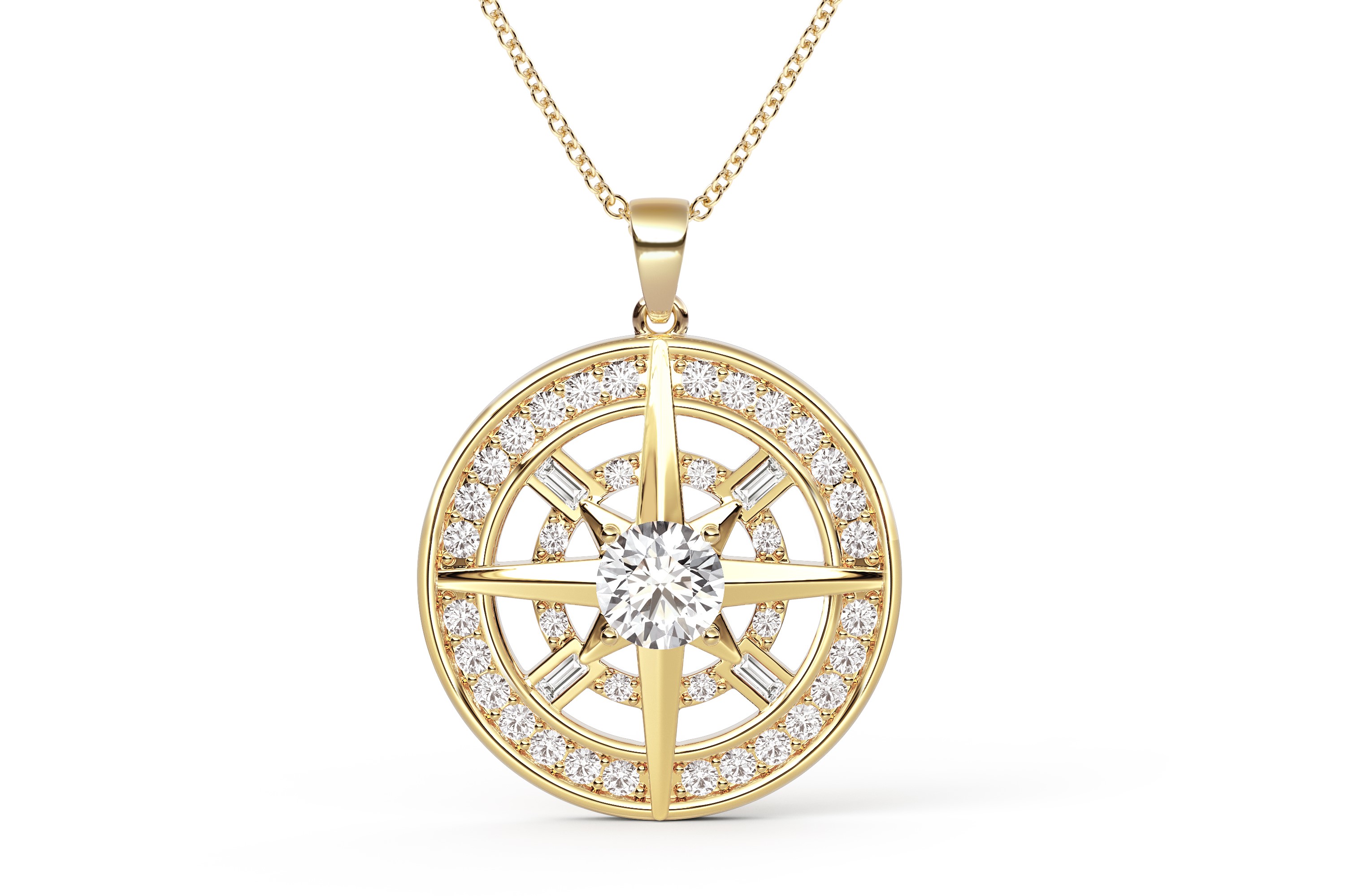The Inner Radiance pendant is structured around a centre diamond with additional stones arranged in a circular format. Journey to Self is designed as a spiral form with a central diamond and is offered across three gold variants. Light Catcher features a centre diamond within an open-circle frame, supported by a halo of stones, and is also available in three metal options. Compass of Light incorporates a star-shaped layout in rose gold with a central natural diamond and a surrounding halo.