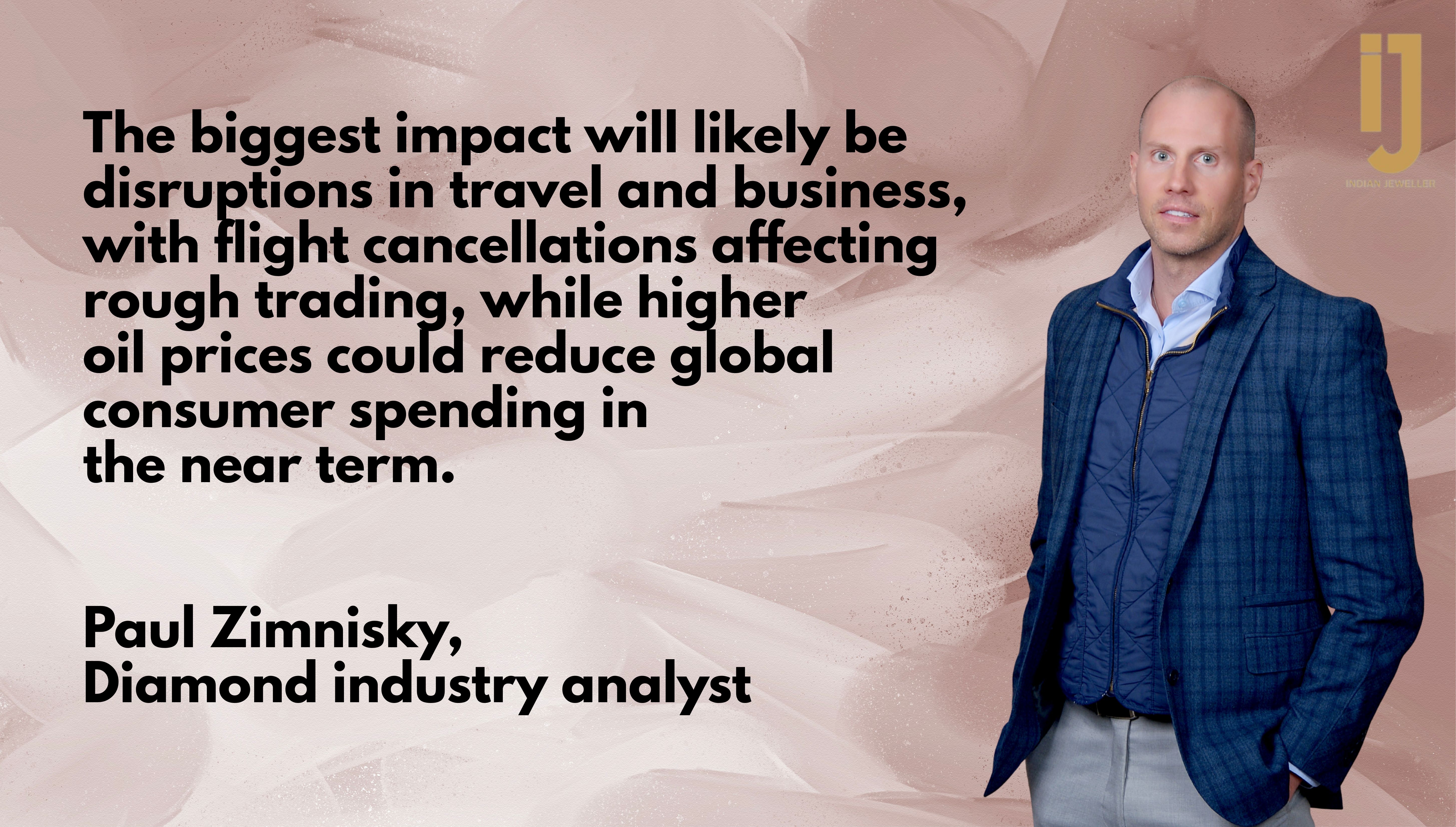 New York-based diamond industry analyst Paul Zimnisky says, “The biggest impact will likely be disruptions in travel and business, with flight cancellations affecting rough trading, while higher oil prices could reduce global consumer spending in the near term.”