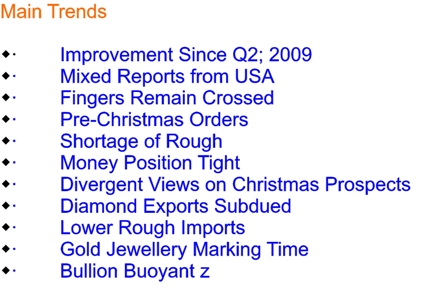 {{Mixed Reports from USA :}}$$ Meanwhile, the news, particularly from the USA the largest single consumer of diamond jewellery in the world remained mixed. In the July-September 2009 quarter, the US economy showed a growth of 0.9 per cent, indicating an annual growth rate of 3-6 per cent. Also, the rate of monthly job losses came down to 1,90,000 in October 2009. Various asset markets were in good shape and were able to spread “feel-good” psychology. However, sale of new houses declined in September and house-prices remained depressed. Despite the reduced rate in the decline of jobs in October 2009, overall unemployment rate in the USA had gone as high 10.2 per cent. Besides, the consumer Confidence Index which showed some improvement in September 2009, declined again in the subsequent month.%% {{Fingers Remain Crossed :}}$$ This makes many people in the diamond trade and industry to keep their fingers crossed about the performance of the US market in the forthcoming Christmas season.