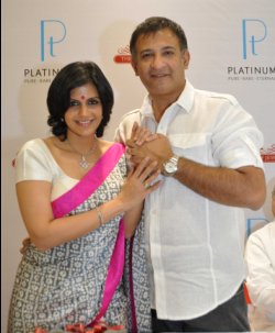 Celebrity couple {{Mandira Bedi & Raj Kaushal}}, celebrated their very special Platinum Day of Love by exchanging Platinum Love Bands at {{C H Jewellers}} in Vadodara.%% Speaking on the occasion, the couple said, “The most special day in anyone’s life is when you realize that you have found true love, when you know that you and your partner are inseparable. Oct 14, 2010 dates our Platinum Day of Love as after 11 years of marriage we discovered that we are soon going to have our first baby. That very special moment when we were overjoyed and hugged each other, was like falling in love all over again. There is no better way to grace the day than to exchange Platinum Love bands, a symbol of true love.”%% The extensive collection of Platinum Love Bands and other pieces of platinum jewellery was prominently on display at the retailer’s store.%% {{ Paresh Soni}}, MD, C H Jewellers, commented, “There has been great surge in the demand for platinum jewellery and more so for platinum love bands as more and more couples want them as it is an expression of true love. Customers are also choosing platinum over other metals as they are now better informed about of its inherent qualities of high value, rarity and emotional appeal. Although platinum love bands are a hit with couples, other platinum jewellery like simple elegant neck-pieces for women or smart and masculine bracelets for men have also been a hot favourite.”%%