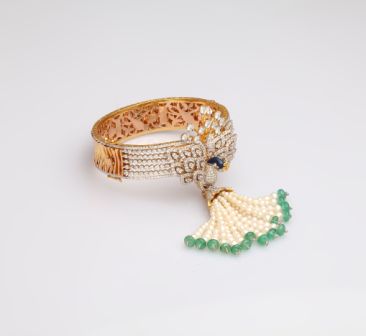 The collection integrates bold tones in flamboyant necklaces, harmonised with earrings that epitomise class along with mesmerising must have stylish cuffs. Dwell in the mystical magic ofdual tones with polki and kundan jewels or simply be awed by the attention with which the flawless selection of gemstonesis expertly interwoven to create majestic designs any bride would love to adorn. %%