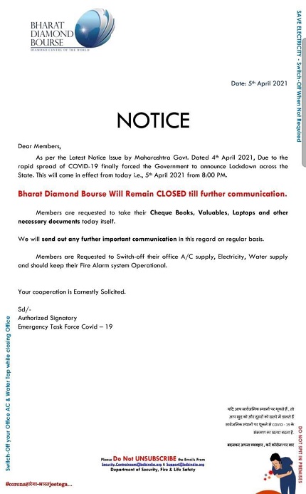 Bharat Diamond Bourse will remain closed till further notice