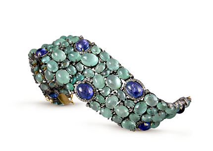 The statement bracelets are crafted in 18K yellow and white gold along with rare gemstones such as tanzanite, pink tourmaline and emeralds