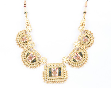 With divine forms of Gods and Goddesses etched on it, this resplendent Temple Jewellery Set symbolizes and celebrates the prosperity and good fortune assured by pure gold, diamond and pearl jewellery from the heirlooms of Motiwala & Sons.